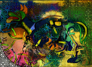 Visions' is a series of images that are inspired by my involvement and open-mindedness to the 'Holistic' or "New Age" movement. The spiritual images reflect my optimistic faith for the future, a belief in personal growth that unite and strengthen the many roads that lead to a celebration of the spiritual power of beauty. Each spiritual image in the series combines fragmented signs and symbols that relate to religious philosophies. This artwork is intended to be seen as a playful journey into the mysterious world of the imagination where personal boundaries of spirituality can be explored. The images begin as simple drawings that evolve by using traditional art practice. This way of working helps me maintain 'its freshness and spontaneity'.